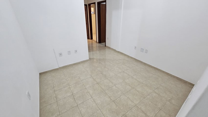 O imóvel dispõe de sala, 2 quartos, banheiro social (com armário), cozinha (com armários) e área de serviço, apresentando ambientes bem distribuídos e funcionais.