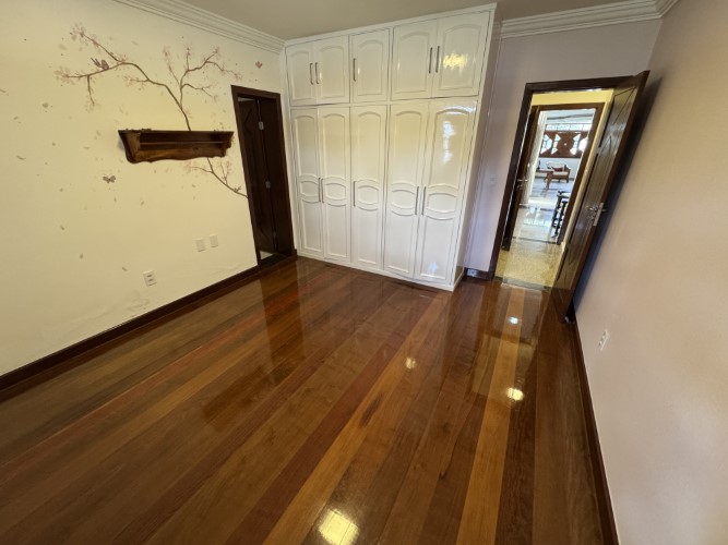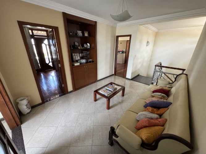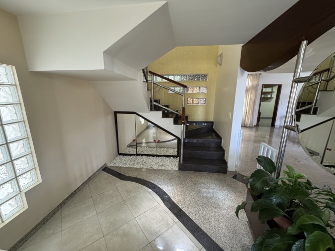A residência impressiona pela amplitude e funcionalidade de seus ambientes. No térreo, dispõe de um belo jardim, área gourmet (com sauna), varanda, hall de entrada, sala para 02 ambientes, sala de TV (com lareira), 02 suítes, escritório, 02 áreas de luz, lavabo e espaço para roupeiro. A cozinha é acompanhada por despensa e área de serviço (com banheiro), além de um amplo quintal ajardinado, depósito, dependência (com sanitário) e 03 vagas de garagem.
