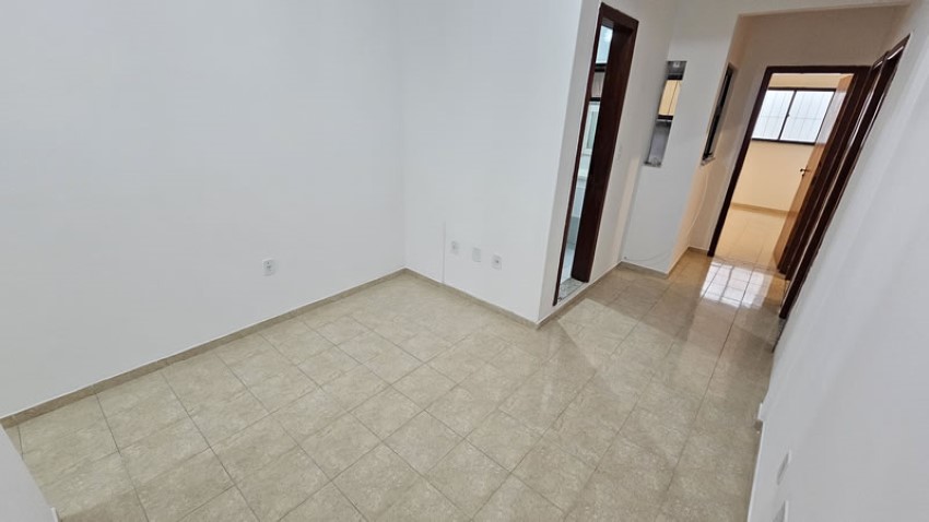 O imóvel dispõe de sala, 2 quartos, banheiro social (com armário), cozinha (com armários) e área de serviço, apresentando ambientes bem distribuídos e funcionais.