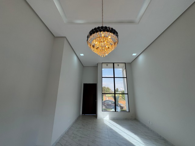 O imóvel dispõe de 02 salas, sendo a principal com janela do chão ao teto, o que proporciona excelente iluminação natural, cozinha (equipada com armários planejados, forno e cooktop), 03 quartos, todos suítes (com armários nos banheiros, incluindo uma suíte com closet completo com armários planejados), lavabo, área de serviço, banheiro de serviço e área externa com espaço gourmet (com churrasqueira) e quintal. A parte frontal da casa possui garagem coberta para 02 veículos.
