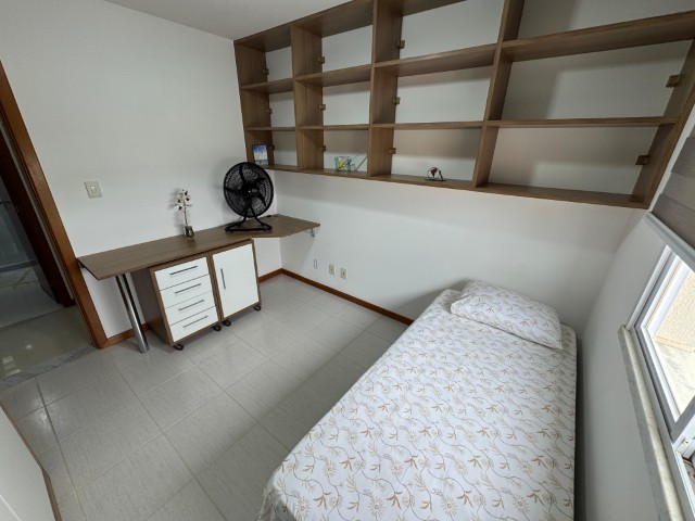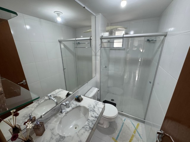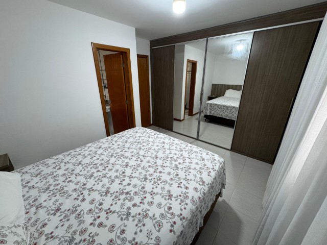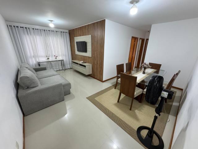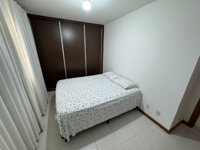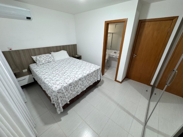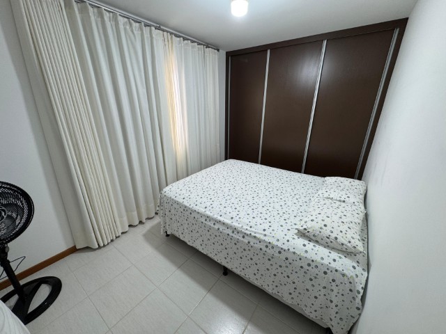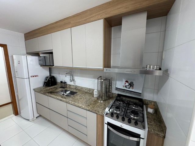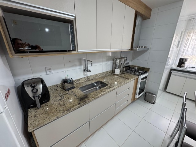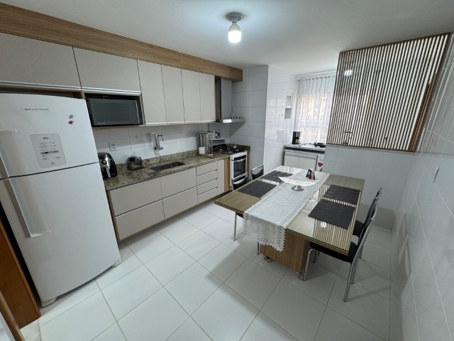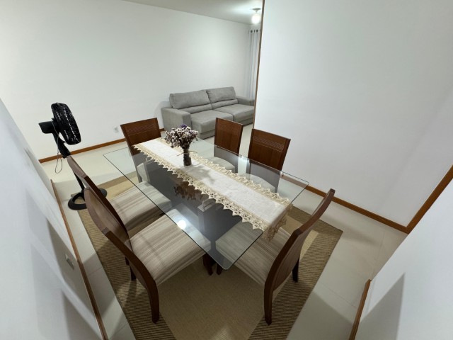 Apartamento no 7º andar, nascente, com ambientes amplos e bem distribuídos, o imóvel conta com sala para 2 ambientes com sofá, painel com TV, aparador, mesa com 6 cadeiras e ventilador; 2 quartos com armários e cama; 01 suíte com armário, cama e ar condicionado; cozinha com armários, fogão, geladeira, mesa com 4 cadeiras, microondas e sugar; banheiro social, área de serviço com lavadora, banheiro na área de serviço e 02 vagas de garagem nº 104 e 206.