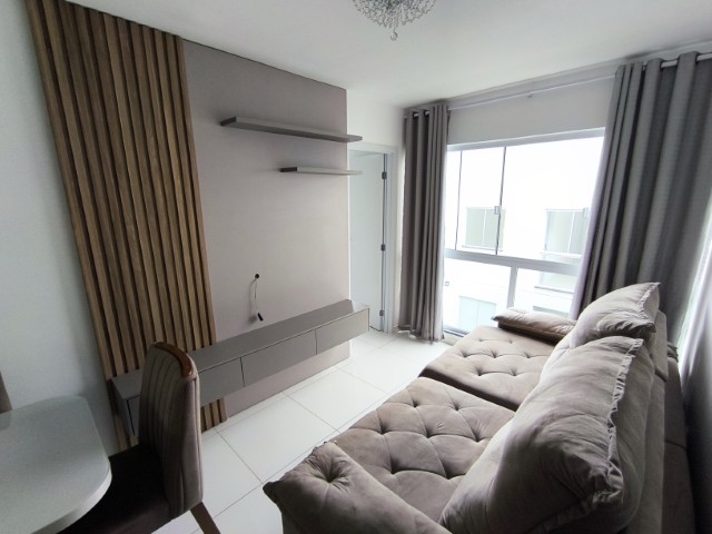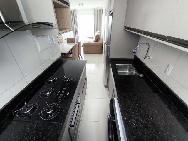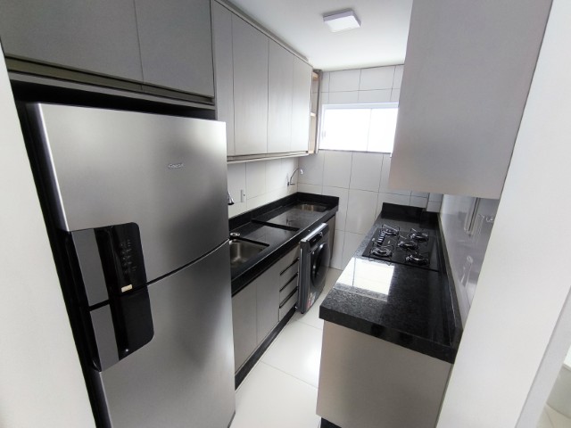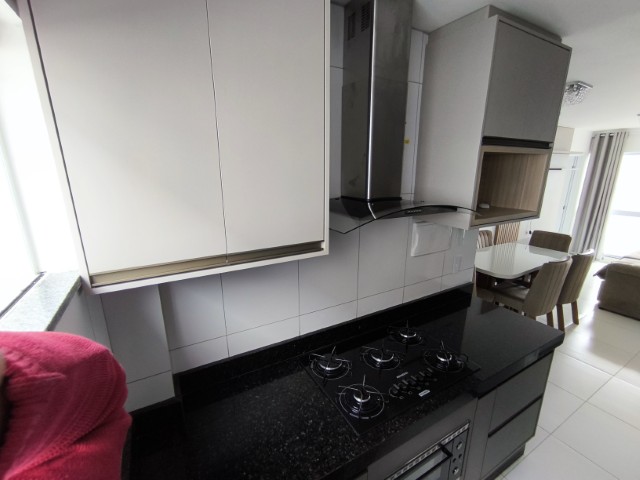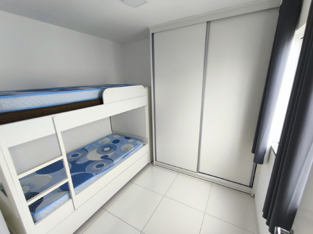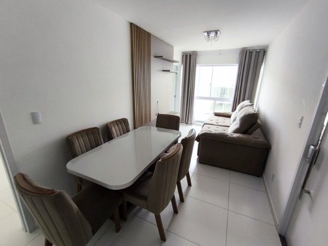 O imóvel dispõe de sala (com mesa para 6 lugares, sofá, painel de TV e cortina), 2 quartos (1 mobiliado com triliche, guarda-roupa e cortinas), sendo 1 suíte, banheiro social, cozinha integrada com área de serviço (com geladeira, armários planejados, cooktop, forno, sugar e máquina de lavar roupas) e 1 vaga de garagem.